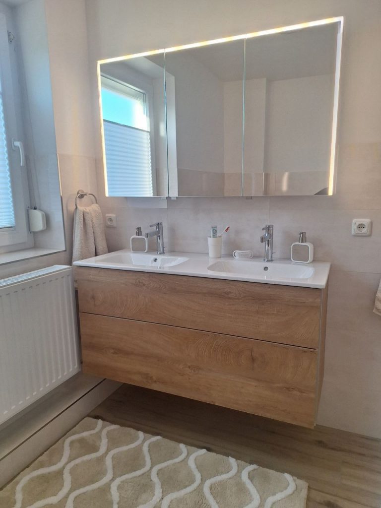 Dieses harmonische Badezimmer lädt zum Entspannen ein. Der große Doppelwaschtisch bietet viel Bewegungsfreiheit, während die Fliesen in Holzoptik dem Raum eine warme und gemütliche Atmosphäre verleihen.